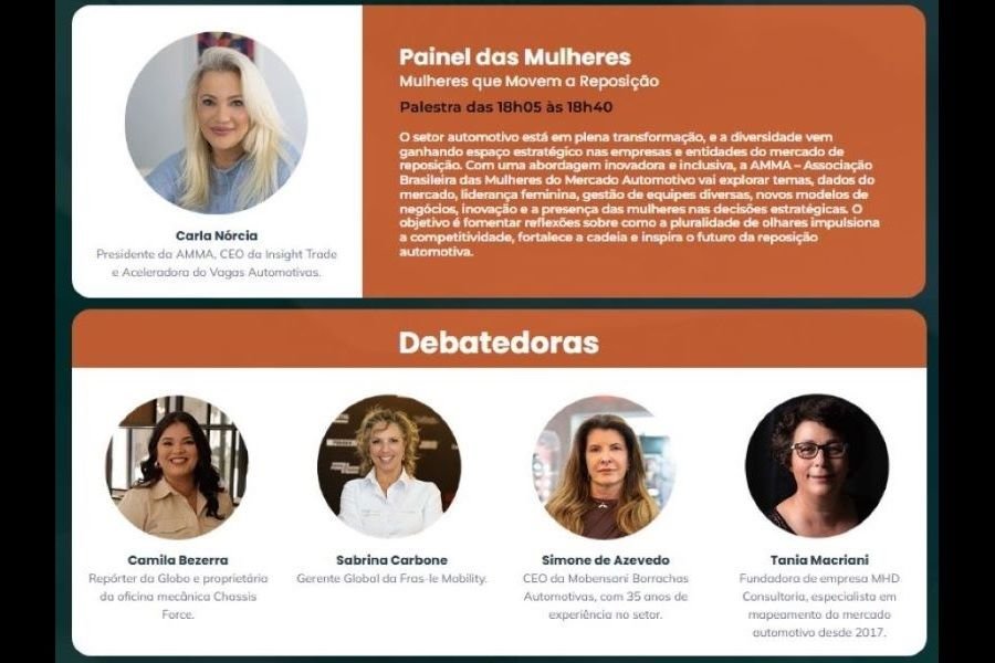 No Painel das Mulheres – Mulheres que Movem a Reposição, que será realizado das 18h05 às 18h40, a AMMA – Associação Brasileira das Mulheres do Mercado Automotivo traz à tona os números, tendências e histórias que provam a importância da liderança feminina. A proposta vai além de inspirar: pretende mostrar como equipes diversas tomam decisões mais criativas, constroem soluções inovadoras e geram vantagem competitiva real para empresas e entidades do setor.