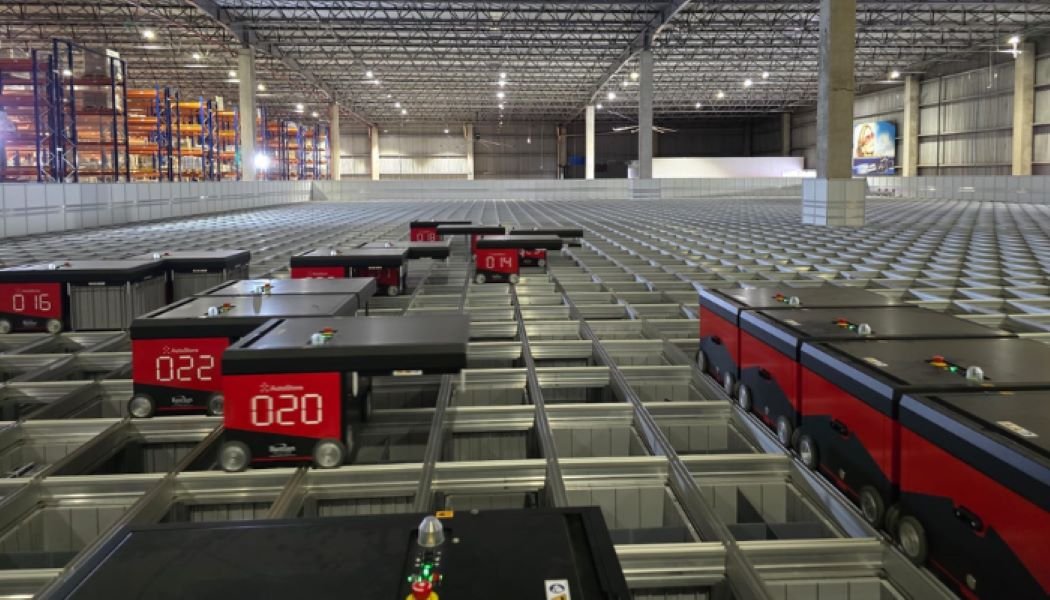 Operação – Atualmente, são 25 robôs circulando simultaneamente sobre trilhos na parte superior de uma estrutura com 16 níveis de empilhamento, composta por 35 mil caixas armazenadas verticalmente, localizando e transportando os itens até estações de separação no modelo goods-to-person. O processo é guiado pela tecnologia picking by light, baseada em iluminação LED que orienta o operador durante a separação dos pedidos, com validação posterior por leitura de código de barras ou QR Code.