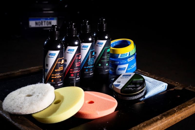Com nova fórmula, a linha Norton Norclean é composta por cinco produtos: polidor refino, polidor lustro, polidor ativador de brilho, cera protetora e a cera cristalizadora que forma uma película de proteção resistente à poluição e raios solares U.V.