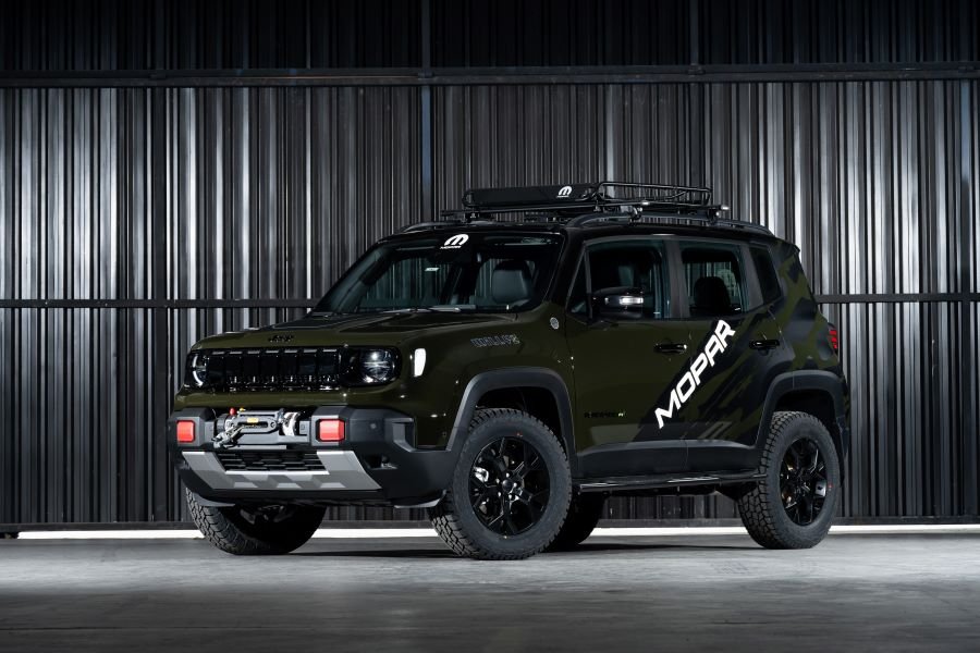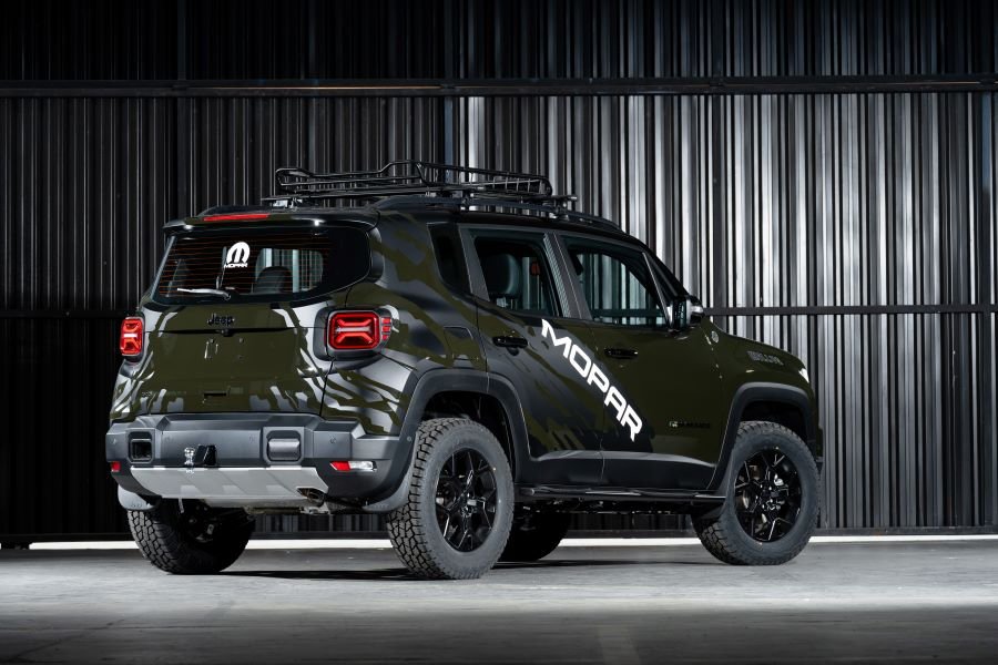 O Renegade Mopar XT, criado pelo time do Design Center da Stellantis e pela Mopar, foi apresentado durante o evento de lançamento do veículo. Rodas em preto acetinado, kit lift de suspensão 2”, amortecedores recalibrados, pneus Yokohama Geolander A/T G018 245/65 R17, rodas com espaçadores de 20mm e bitolas que compensam a elevação de altura para manter estabilidade são alguns dos itens que chamam a atenção logo de cara.