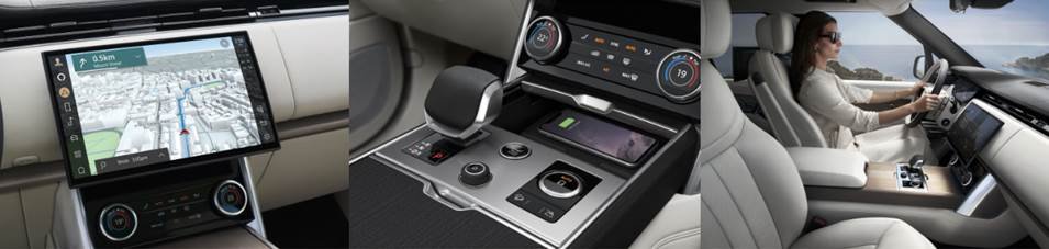 O Novo Range Rover também eleva a premiada tecnologia de infoentretenimento Pivi Pro da Land Rover e oferece a maior tela sensível ao toque de todos os tempos. A tela curva e flutuante de 13,1 polegadas incorpora a leveza arquitetônica do interior a um design de quadro minimalista, que fornece controle intuitivo de todas as principais funções do veículo, usando a mais recente tecnologia para fornecer uma interface inspirada em smartphones, aliada a convenientes interruptores para o controle climático.