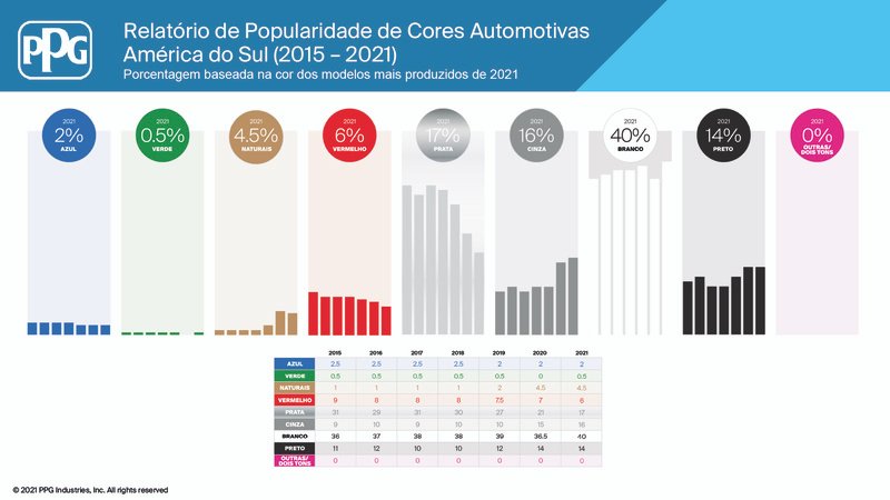 O relatório de popularidade de cores automotivas referente a 2021 da PPG, umas das maiores fabricantes mundiais de tintas e revestimentos, destaca que 40% dos modelos mais produzidos no ano, na região da América do Sul, são da cor branca, seguidos pelas cores prata (17%), cinza (16%) e preta (14%).