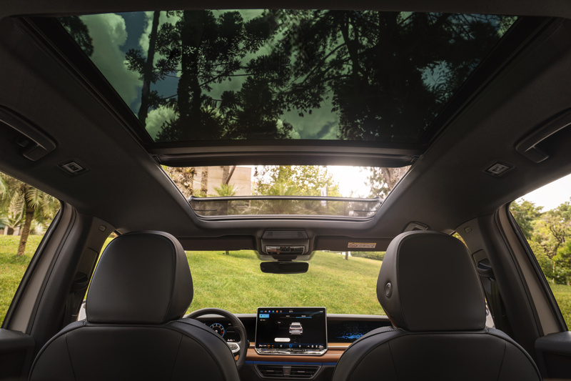 Da cabine, também é possível controlar a abertura do teto solar panorâmico pelos controles sensíveis ao toque no plafon de teto e a abertura da tampa elétrica do porta-malas com função Easy Open & Close – passando o pé na parte interior do para-choque traseiro, – pelo botão posicionado na porta do motorista.