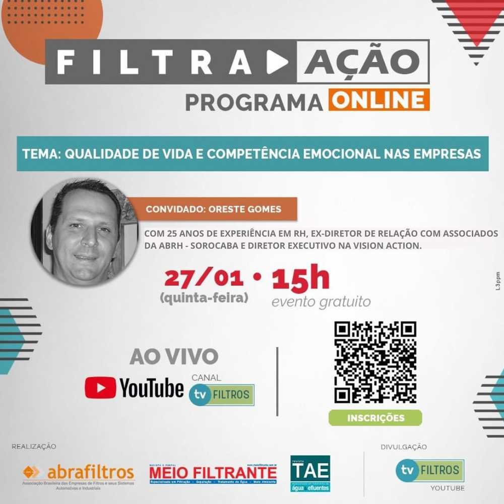 O “Programa Filtra Ação”, canal de conteúdo online da Abrafiltros – Associação Brasileira das Empresas de Filtros e seus Sistemas – Automotivos e Industriais e das revistas Meio Filtrante e TAE, apresenta, no dia 27 de janeiro, às 15h, na TV Filtros, no YouTube, o tema “Qualidade de Vida e Competência Emocional nas Empresas”, com Oreste Gomes, diretor executivo na Vision Action. “O tema é relevante para os negócios já que a qualidade de vida pode interferir na saúde do gestor e de outros profissionais, impossibilitando, muitas vezes, ser assertivo ao tomar decisões e também ao se relacionar com outros colaboradores”, afirma João Moura, presidente da Abrafiltros.