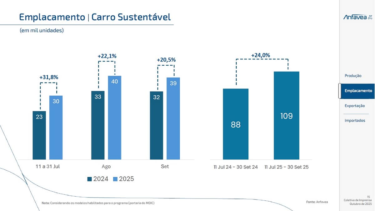 Desde que foi implementado, em 11 de junho, o programa Carro Sustentável gerou 109 mil emplacamentos de versões dos modelos credenciados, comercializados com o IPI zerado. No mesmo período do ano passado, segundo levantamento da Anfavea, estes mesmos veículos tiveram 88 mil emplacamentos, o que representa crescimento de 24%.