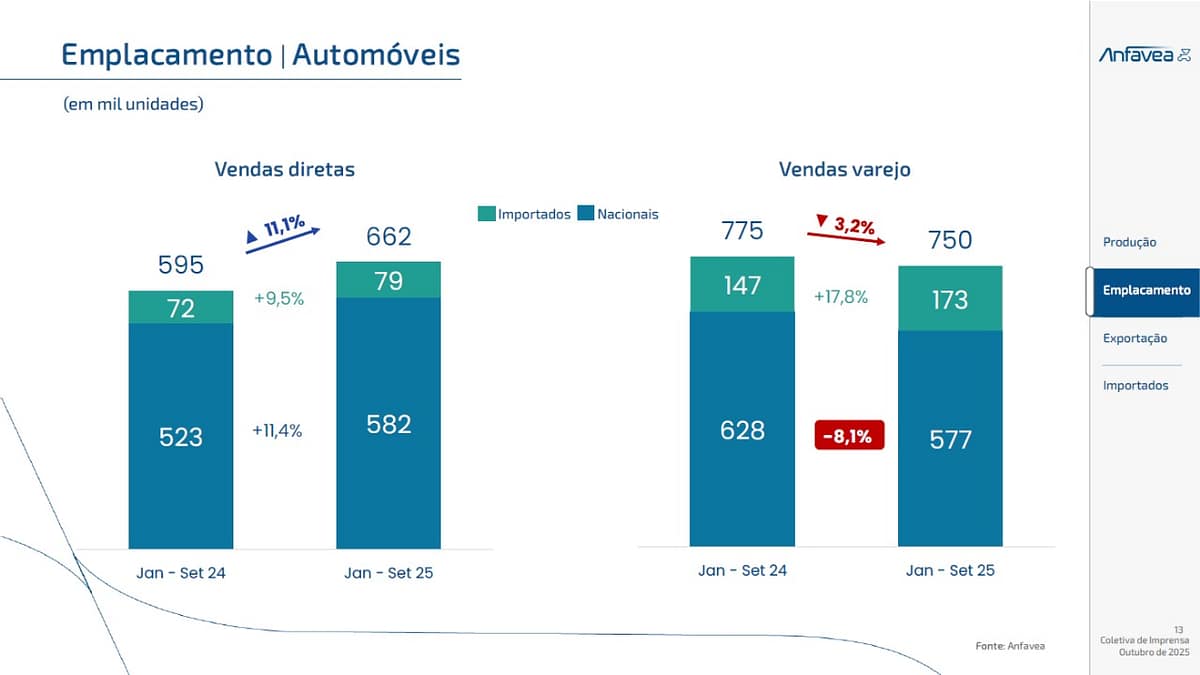 Nos primeiros nove meses do ano foram 750 mil automóveis vendidos no varejo, recuo de 3,2% na comparação com o mesmo período do ano passado. Destes 173 mil são importados e 577 mil nacionais: no período os importados registraram alta de 17,8% e os nacionais caíram 8,1%.