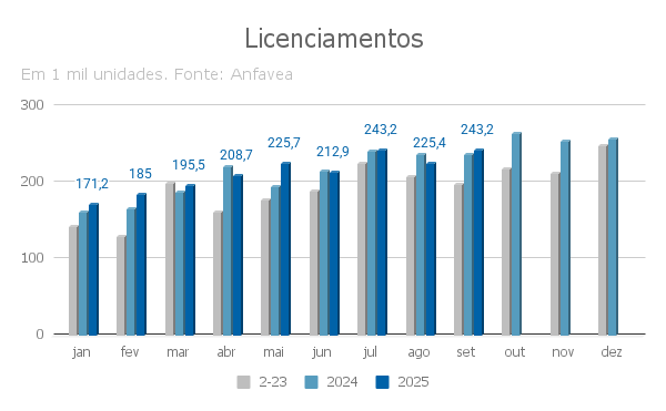 Os emplacamentos de veículos avançaram 2,8% no acumulado de janeiro a setembro, somando 1,9 milhão de unidades. No mês passado foram 243,2 mil licenciamentos, alta de 7,9% sobre agosto e de 2,9% sobre setembro de 2024.