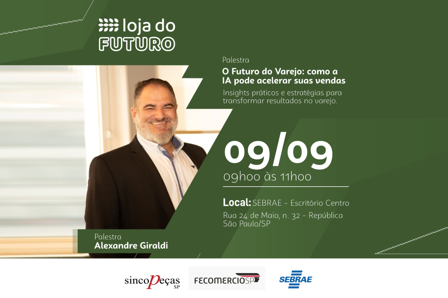 🎤 Palestrante: Alexandre Giraldi, consultor de negócios do Sebrae-SP, especialista em Marketing, Vendas e Gestão de Negócios.