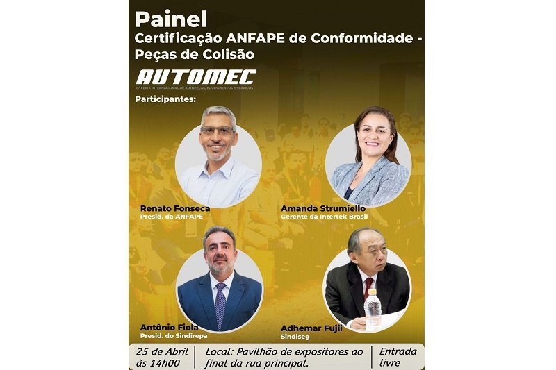 Antonio Fiola, presidente do Sindirepa Brasil, participará, no dia 25 de abril, às 15 horas, no Pavilhão dos Expositores, do Painel “Certificação de conformidade em peças de colisão”, organizado pela Anfape (Associação Nacional dos Fabricantes e Comercializadores de Autopeças para Mercado de Reposição). Além de Fiola e Renato Fonseca, presidente da Anfape, também estarão presentes Amanda Strumiello, gerente da Intertek Brasil, e Adhemar Fujii da Sindiseg. A proposta é promover debate sobre como otimizar o uso de peças de reposição na área de colisão, com a garantia de segurança e qualidade necessárias.
