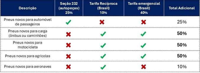 De acordo com a entidade, os pneus de passeio permanecem com taxação de 25% (já haviam saltado de 10% para este patamar em maio), enquanto os pneus de aeronaves (não fabricados no Brasil) passaram a ter tarifa adicional de 10%.