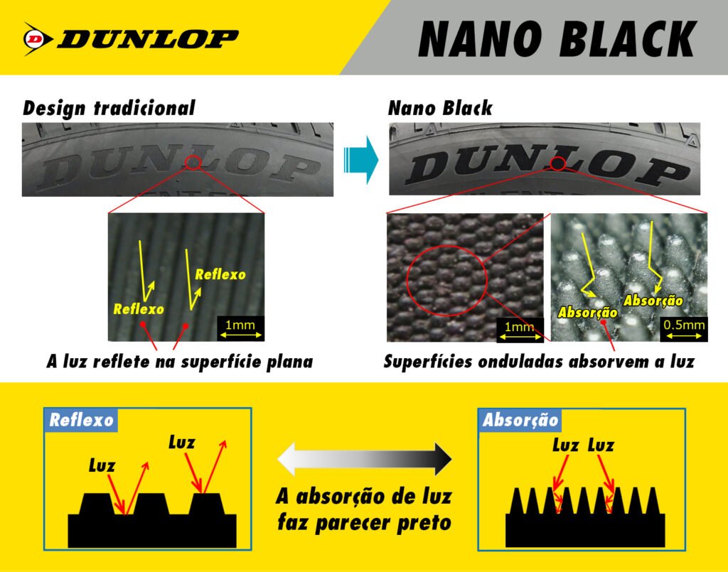Técnica do “Nano Black” incorpora conceito inovador já que possui saliências finas à superfície da parede lateral do pneu maximizando a área de absorção da luz