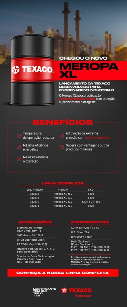 A Texaco Lubrificantes lança neste mês a nova linha de lubrificantes premium Meropa XL, que oferece diversos benefícios para aplicação em redutores industriais: redução da temperatura operacional, maior eficiência energética e vida útil de rolamentos e engrenagens, bem como maior resistência à oxidação, quando comparados aos óleos minerais do mercado e proteção superior contra o desgaste e corrosão.