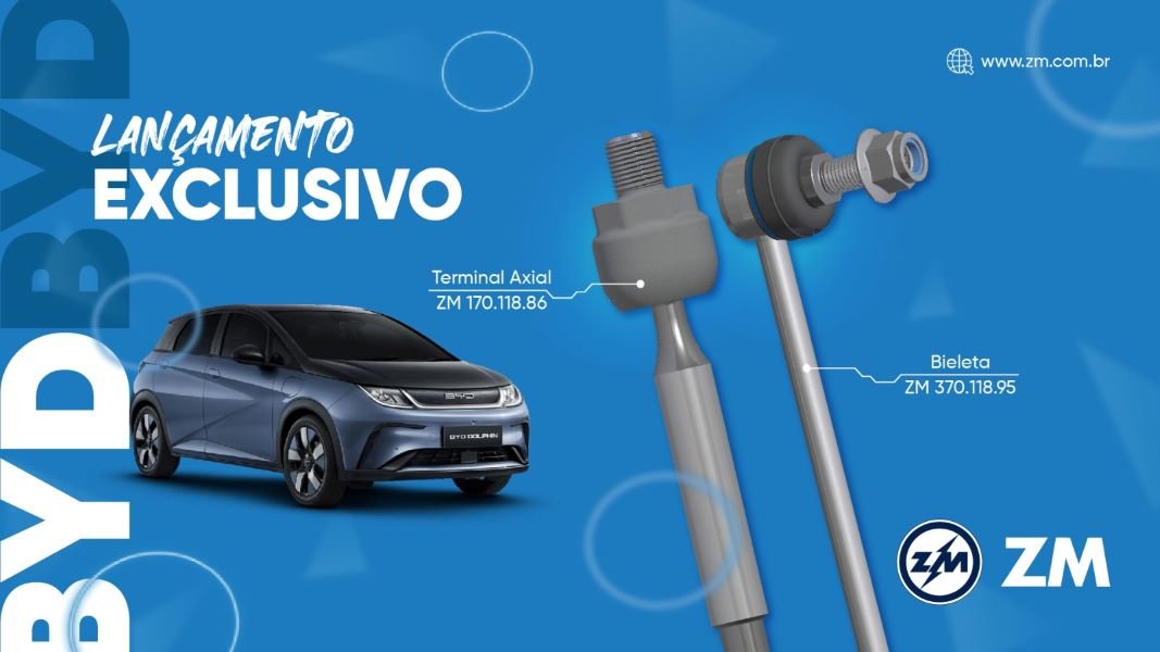 Indústria 100% brasileira com sede em Brusque, Santa Catarina e mais de 40 anos de tradição e excelência na fabricação de componentes para os sistemas elétrico, de suspensão e direção automotiva, a ZM se destaca mais uma vez ao ser a primeira marca a oferecer ao mercado de reposição nacional o Terminal Axial para o modelo Dolphin e Bieleta para o Song Plus, ambos veículos elétricos da renomada marca BYD.