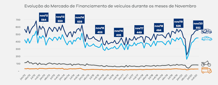 As vendas financiadas de veículos em novembro de 2020 somaram 552 mil unidades. Esse número representa uma alta de 4,9% em relação a novembro de 2019 e engloba veículos novos e usados – incluindo motos, autos leves e pesados – em todo o País. Considerando a série histórica, o volume de financiamentos registrado em novembro confirma a tendência, iniciada em outubro de 2020, de manutenção de vendas a crédito em níveis semelhantes ao do período pré-pandemia.