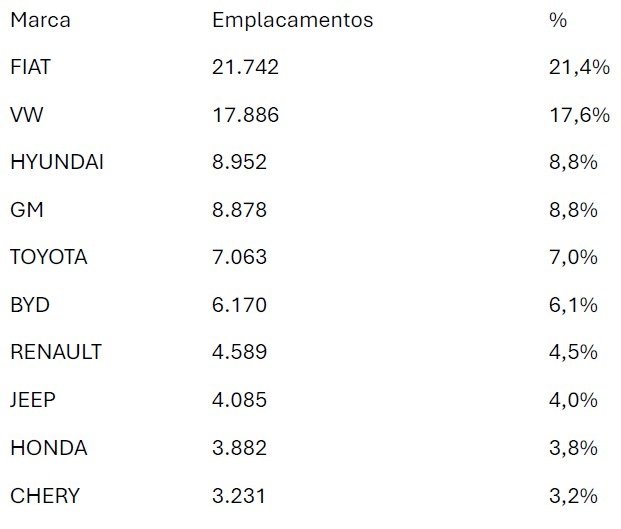 Montadoras: Fiat segue líder, mas perde share; VW, Renault, Chery e Toyota ganham espaço