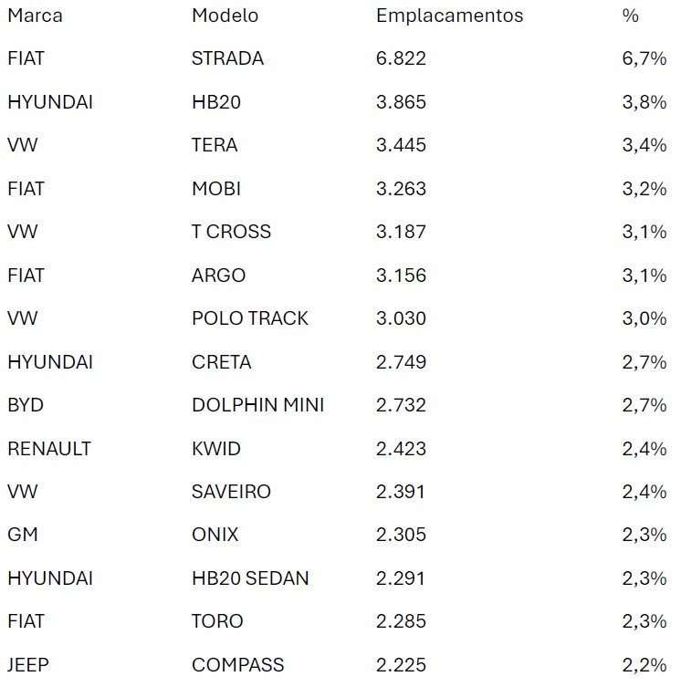 Modelos: Strada segue isolada na ponta; ranking continua concentrado em compactos, SUVs e picapes leves