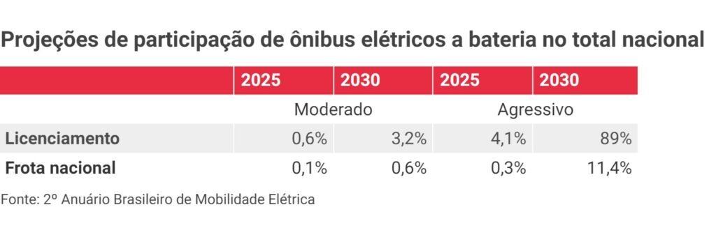 Para 2030, o número de unidades vendidas representaria um futuro em que 89% dos ônibus licenciados seriam elétricos a bateria, uma frota projetada em 37.150 unidades, uma participação de 11,4% na frota nacional.