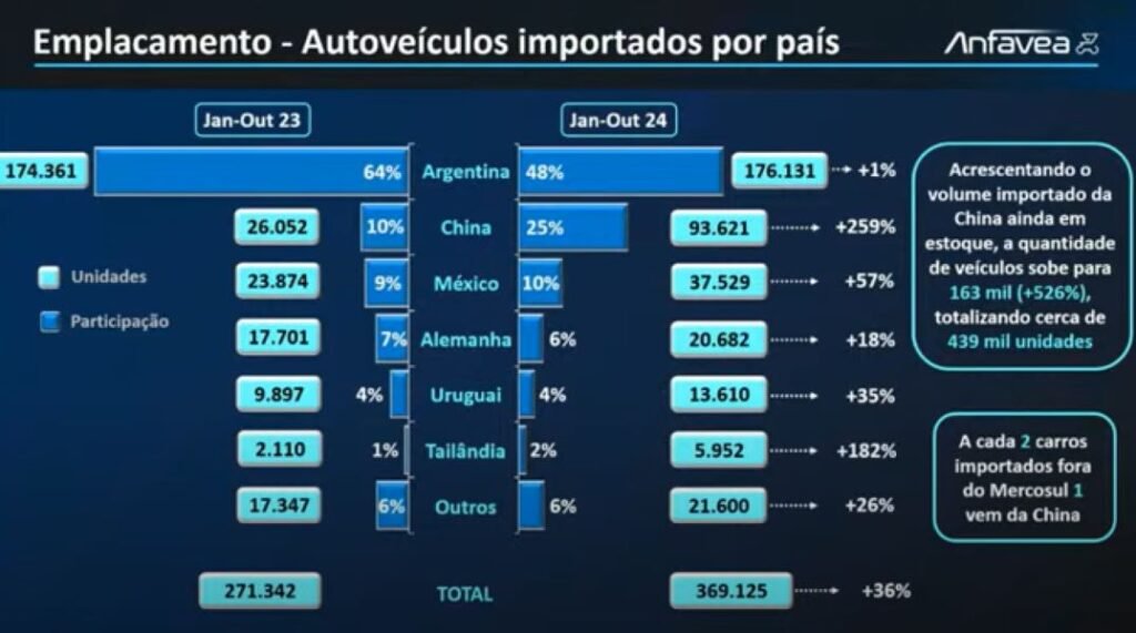 Em outubro, perto de 47 mil veículos importados de todas as origens foram negociados no mercado interno, maior quantidade para um único mês no ano e 10,4% a mais do que em outubro de 2023. Ao longo dos dez primeiros meses, os licenciamentos superaram 369,1 mil unidades, 36% a mais na comparação anual.