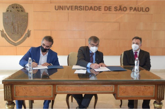 A Volkswagen do Brasil e o Centro de Inovação da Universidade de São Paulo (InovaUSP) firmaram ontem (22) o memorando de entendimento com foco em três projetos a serem desenvolvidos nas áreas de semicondutores, software e motores flex. Pablo Di Si, chairman executivo da Volkswagen América Latina, Prof. Dr. Carlos Gilberto Carlotti Jr, reitor da Universidade de São Paulo, e Prof. Dr. Marcelo Knörich Zuffo, coordenador do InovaUSP, assinaram o documento (da esq. para dir. na foto principal).