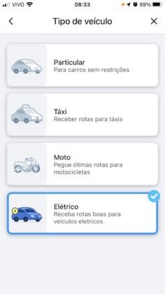 Para acessar as informações específicas sobre carros elétricos, o motorista precisa trocar o tipo de veículo nas configurações do aplicativo. Para isso, basta acessar a opção “Meu Waze”, ir em “Configurações”, clicar em “Detalhes do veículo”, em seguida “Tipo de veículo” e selecionar “Elétrico”.