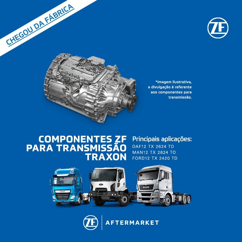 A ZF Aftermarket ampliou sua cobertura para o mercado de reposição com componentes da transmissão TraXon. Suas principais aplicações são para caminhões DAF12 TX 2624 TD, MAN12 TX 2824 TO e Ford12 TX 2420 TD.