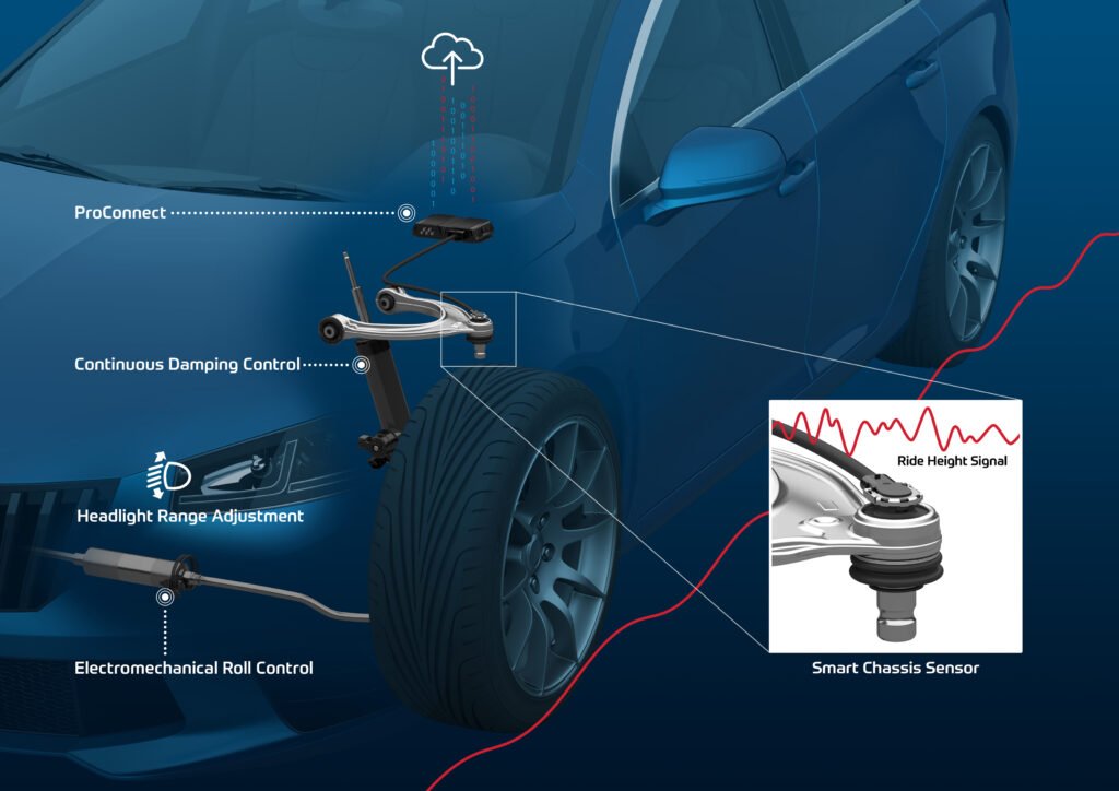 O Smart Chassis Component da ZF pode ser conectado à unidade ZF ProConnect e interagir com o sistema de controle de amortecimento contínuo da empresa. Ele pode ser integrado aos sistemas de estabilização antirrolagem e ao nivelamento do farol